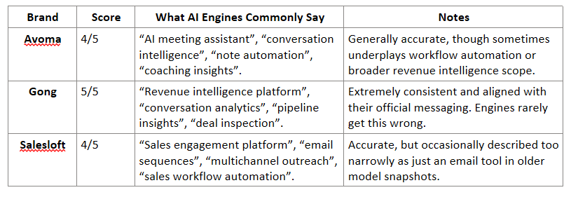 Read what the engine says about you and check whether it matches the story you are telling today. Are important capabilities missing? Has it misunderstood who your product is built for? Do your differentiators come through clearly or do you blend into a generic category with everyone else?