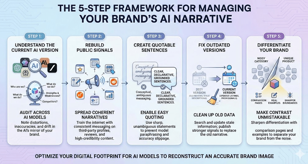 Start by auditing how different AI systems describe your brand. Identify inaccuracies, outdated assumptions, or competitor blending. Then strengthen your public signals: refresh old pages, create clear comparison content, update third-party listings, and publish structured, high-clarity explanations of your product. These signals help LLMs form a more accurate and consistent mental model of your offering.