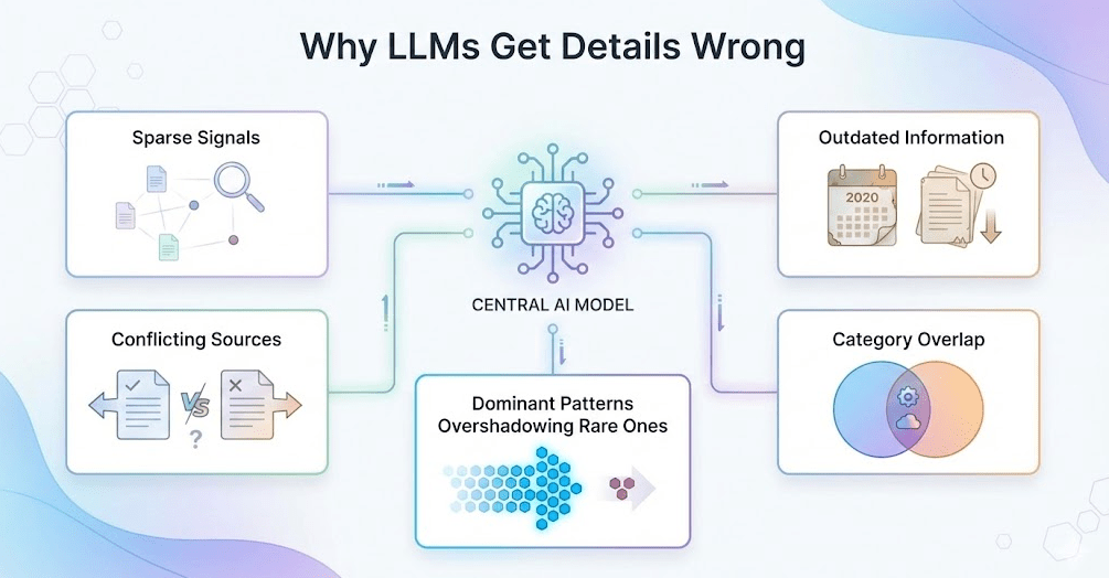 Large language models rely on patterns found across the public internet. If your product has sparse, outdated, or inconsistent signals, the model fills gaps using nearby patterns or competitor references. This can lead to vague, generic, or entirely incorrect summaries. Improving the density and consistency of your public-facing information helps reduce these mistakes.
